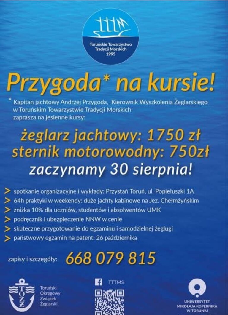 Toruńskie Towarzystwo Tradycji Morskich zaprasza na kursy przygotowujące do uzyskania patentów: Start kursów: 10 kwietnia Program i organizacja szkolenia Część teoretyczna: Część praktyczna: Szkolenie obejmuje pełne przygotowanie do egzaminu państwowego. Zniżki Uczniowie, studenci oraz absolwenci Uniwersytetu Mikołaja Kopernika w Toruniu…